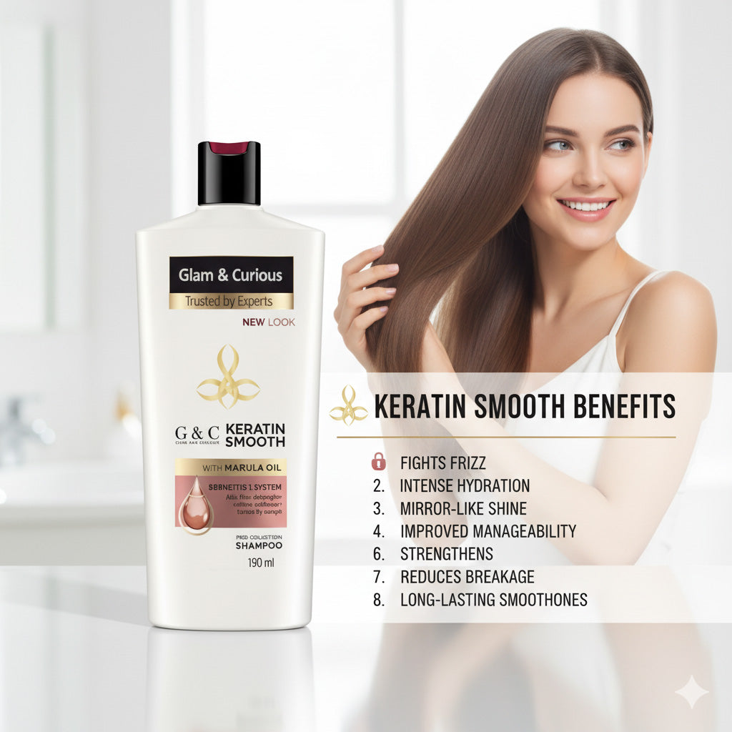 Experience luxurious, salon-quality hair care at home with Glam & Curious Keratin Smooth Shampoo, expertly formulated with Argan Oil and Hydrolyzed Keratin to deliver sleek, smooth, and radiant hair after every wash. This professional keratin shampoo for dry, frizzy, and color-treated hair gently cleanses while restoring essential nutrients to leave your hair soft, manageable, and visibly healthy.